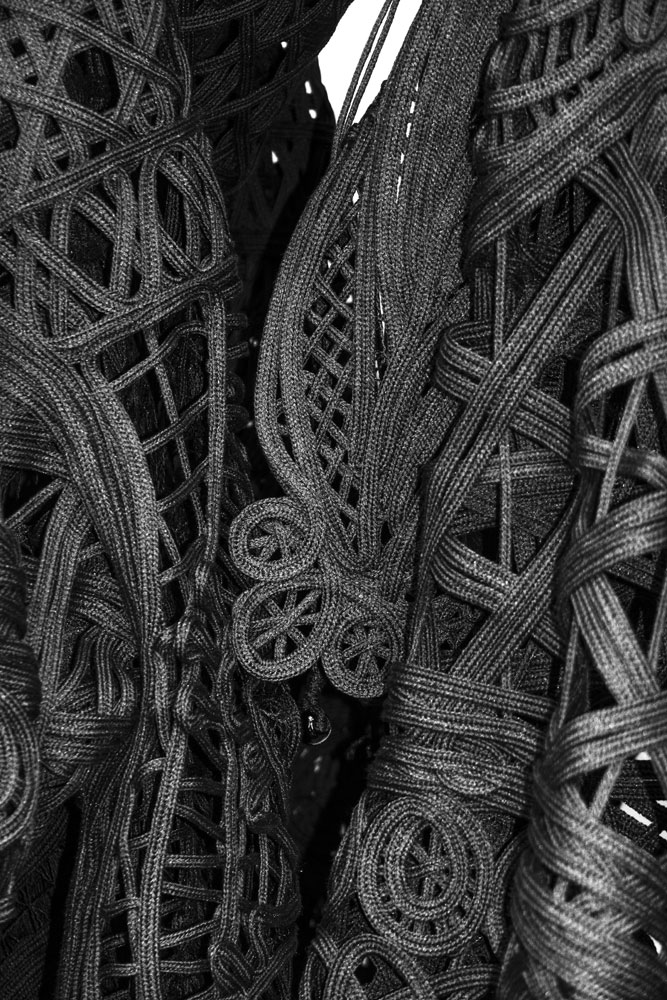 She came to a shoelace factory, asking them to create soft but firm original linen thread with gloss, that was then flattened by a sewing machine. She would then embroider this together, starting off with small samples. She wove strings together imagining how it would embrace the body, just as plants would be woven into baskets. To create the transformative design, she drew directly onto the toile. And finally, she created her own basket garments that changes its look depending on the item worn underneath, just like the inspiring primitive but flexible traditional baskets.