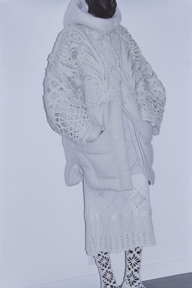 今回のコレクションの創作過程の初期、黒河内はヨーロッパからの帰り道に、島国アイスランドに立ち寄った。自分が、地球という惑星に生まれ、生きているのだということを教えてくれる風景に包まれ、体いっぱいに感じているときに、事故が起きて、アイスランドの地面に投げ出された。大事に至らなかったのは、投げ出されたところが、ふかふかと柔らかい土のうえに広がる羽毛布団のような草地だったからだ。細く長い雑草が、露に濡れて光る姿には、生命の強さが宿っていた。この美しい地球の生命力に守られているーー 長く伸びた草に包みこまれたこの体験を、形にしたい、とデザインを始めた。作りたかったのは、輝きのある繊細な編みを身にまとうような服だった。人間が身につけることができる、柔らかいけどハリのある紐状の素材を、刺繍することでつなぎ合わせれば、花や植物のモチーフを表現しながら籠のような服を作れるのではないかと考えた。靴紐の工場に依頼して、光沢もハリもありながら肌に触れても柔らかいリネンの糸を紐状にし、籠を編むように複雑な軌跡を描きながら刺繍を施した。小さいパーツから試作を始め、植物が籠を編むように自分の体を覆う様を想像しながら、トワルに一筆書きの要領で直接絵を描き、それをデザインに起こした。用途によって姿を変えることのできる籠のプリミティブでありながら柔軟な姿にインスピレーションを受けて、アイテムごとに姿を変える、籠でできた服をデザインした。