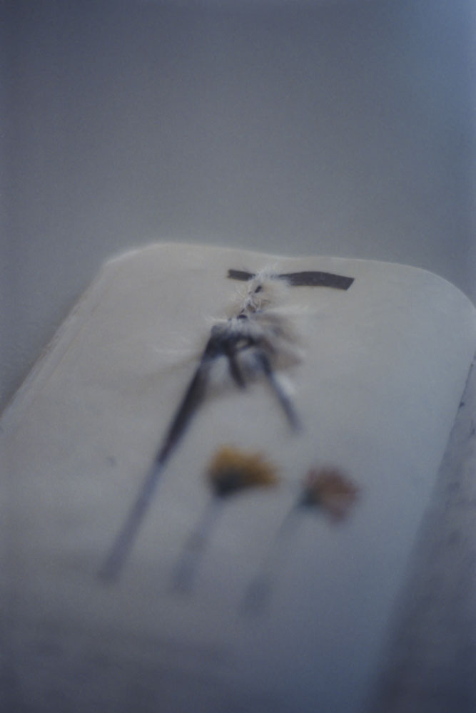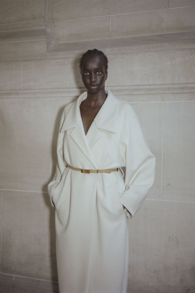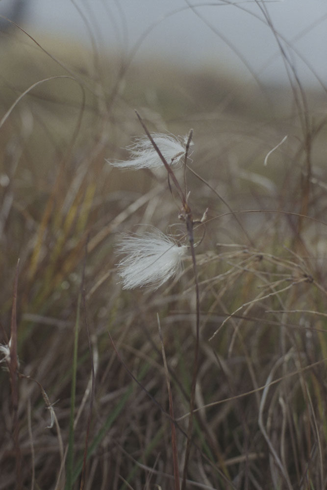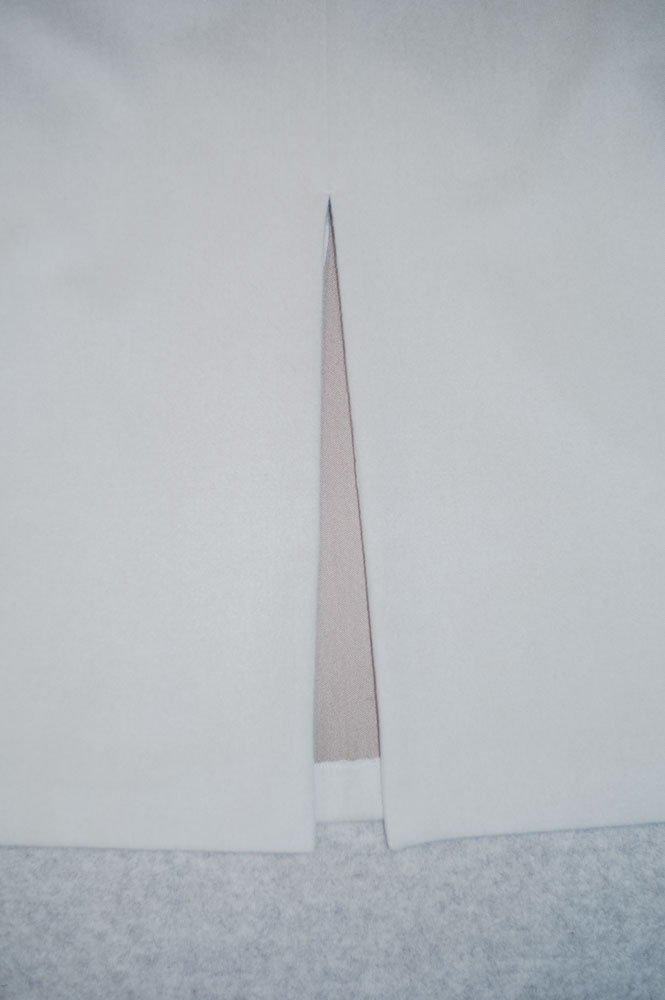 アイスランドで放り出された大地には、朝露で光る綿毛のような草が無数に生えていた。その光景の彩りを、生地に表現したいと思った黒河内真衣子は、その草を一本、押し草として持ち帰り、工場に渡した。アイスランドの大地をイメージした茶色のウールを経糸に、綿毛の色をベースに選んだオフホワイトのシルクを 緯糸に、ひとつの生地に織りなし、自分の体をクッションのように守ってくれたホワッと咲いた綿毛の草原のテキスチャーを、生地の表面に加工を施すことで起毛するシャギー加工で表現した。一見、オフホワイトだけれど、その向こうにほのかな茶色が見える生地を、ロングコートやボリューム感のあるショートジャケットにデザインすることで、草原の生地に体を包まれる体験を再現した。ただでさえ繊細なシルクウールにあえて起毛の加工を加えた生地は、時間の経過とともに、そのハリを失っていくだろう。コートに包まれながら、一緒に年を取っていく感覚で着てほしい。