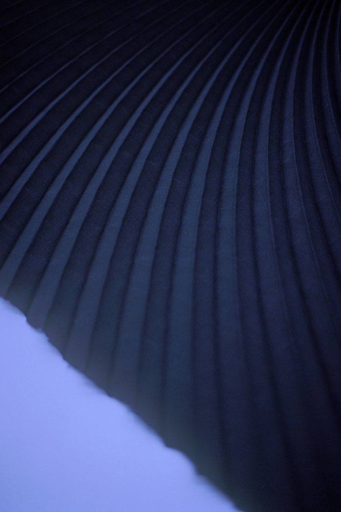 The nocturnal window welcomes the moonlight in. Light and shadow loosely ridged streaming through the blinds, continue painting beautiful lines. In ‘The Nocturnal Window’, curved pleats are overlapped with a night’s encounter with light and shadows.
