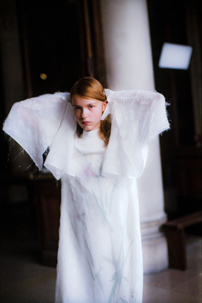One of the most special pieces in this collection is a dress, made up of a transparent silk fabric, double layered silk underneath, Kiryu embroidery and prints of plants seen through them just like Kurogouchi saw them behind the glass window. Inspired by Shiros who left us and cocoons, this dress was Kurogouchi's answers to the wonders of “Embrace”.
