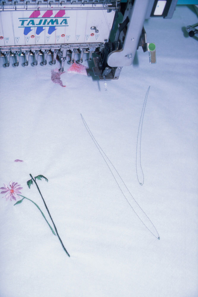 特にスペシャルなドレスは、透明フィルムのシルク生地の下にさらに、2枚のシルク生地をレイヤード、植物のドローイングを桐生で施した刺繍と、プリントで表現し、植物の姿が生地から透けて浮かび上がるよう仕上げた。「包む」を追求する旅の中で、何度も目に入ってきた窓越しの風景が、このドレスに昇華した。繭を遺して逝ったシロちゃんたちにインスピレーションを受けたこの生地は、黒河内にとって、Embrace=包むを表現するひとつの答えとなった。