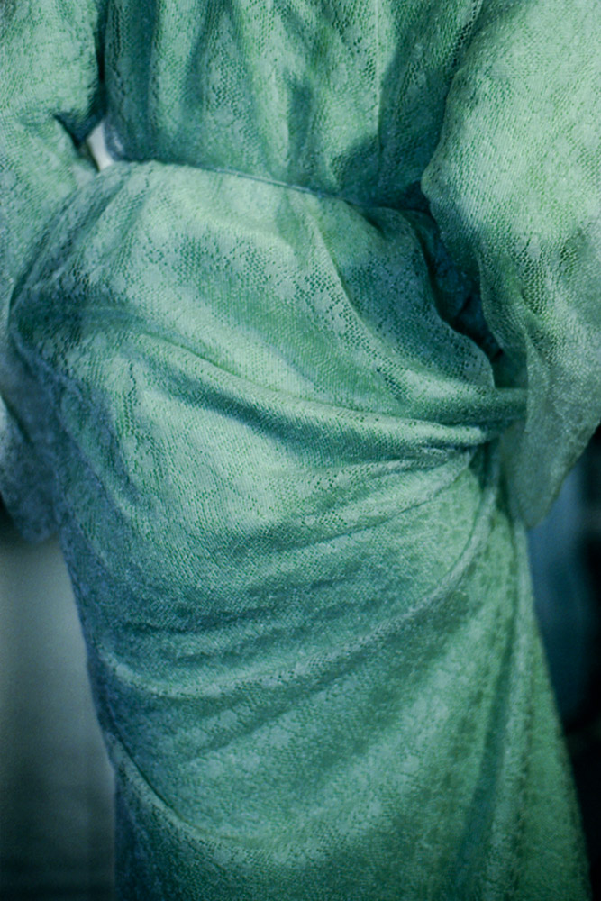 Eventually, it was the weavers' experiences, knowledge and imagination that made the knit possible, fully materialising Kurogouchi's vision. When worn, the skin you could see through behind the woven net highlights the beauty of the garment as well as herself.