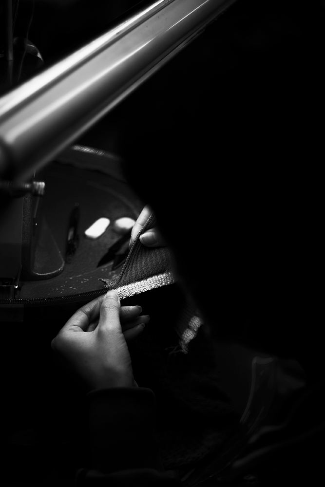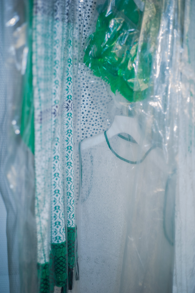 Layering tulle and knit, due to the nature of difference in intensity, requires a meticulous method. With the factories in Nagano and Niigata, Kurogouchi tested applying two different techniques; Inlay and Jacquard which first resulted in many unexpected cut threads and holes. But in order to materialise the feeling of being inside of kaya, helped her distinguish the existence of inside and outside, it would have to be a knitwear delicate as thin as skin.