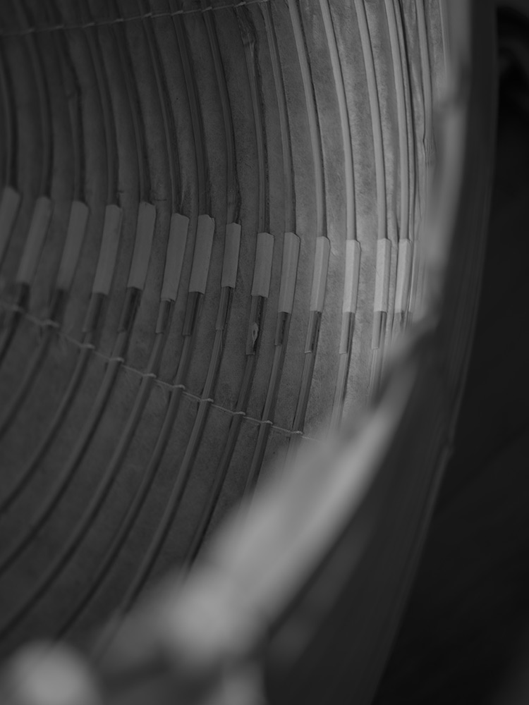 『日本のかたち』(1978) の中に提灯の形を見つけた時、それらがどのように作られているのか興味がわいた。提灯には大きく分けて二種類がある。骨組みとなる竹ひごを頂点から下へ向かって螺旋状に巻いていく「巻骨式」と、竹ひごで一本ずつ作った輪を木型にはめ、等間隔に平行に組んでいく「地貼り式」である。「巻骨式」は製作にかかる時間を大幅に短縮できるため、現在は日本の提灯の約九割がこの方式を採用しているそうだ。一方、「地貼り式」提灯は「巻骨式」より多くの工程を要することもあり、職人の減少も相まって、現在では工房は数えるほどしか残っていない。そのわずかな作り手を訪ねるため、京都へ向かった。