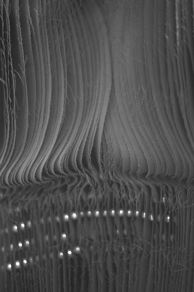 緩やかな変形の曲線を描いたドレスたちは、動くたびに不均一に揺れる。しかし、遠くから眺めると、豊かなふくらみを帯びた身体の一部のようにも見える。