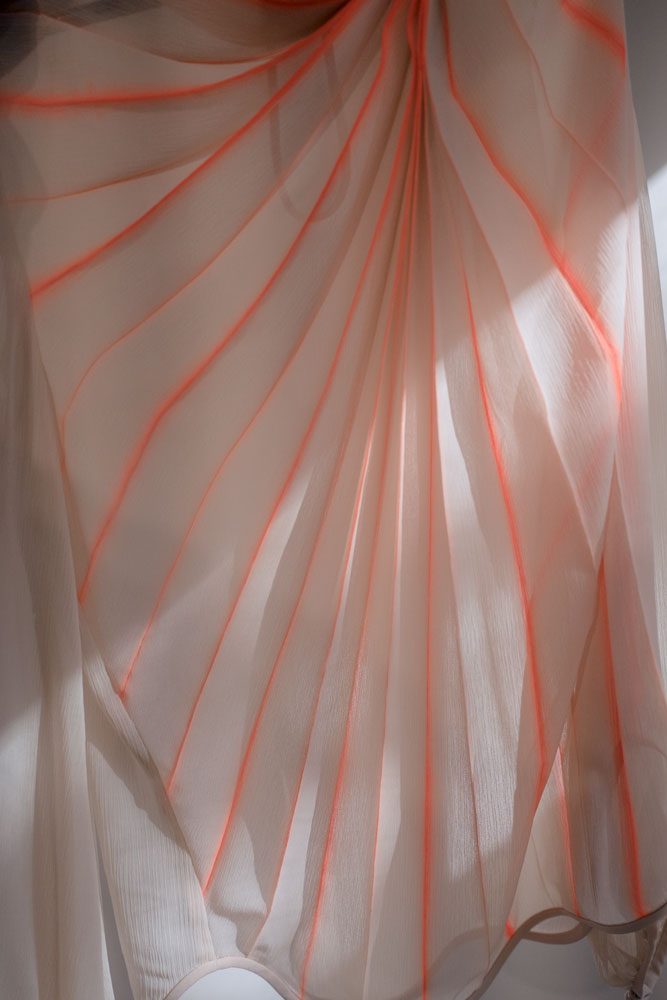 色や線の太さ、生地によっては古風な表情を見せる板締め絞り。今季は、絞り染めでは珍しいポリエステル生地を採用し、月明かりの影がもたらす黒や鮮烈な西日の蛍光オレンジを華奢なラインで染色することで、曖昧な光と影のグラデーションを今日的なバランスで表現しています。