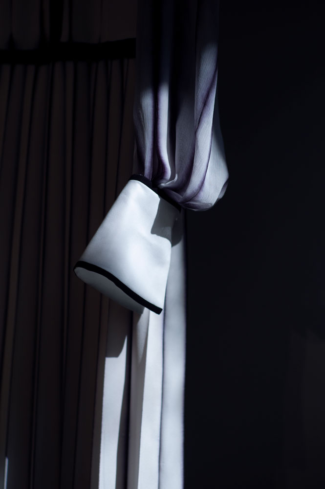 Different use of colors, line weight, or fabric brings out a sense of antiquity in Itajime Shibori. This season the fabric chosen for this technique was polyester, unfamiliar to Itajime Shibori. The shadows the moonlight paints or the bright orange afternoon sun dyed in a delicate line, expressing a faint gradation of light and shadows of our daily balance.