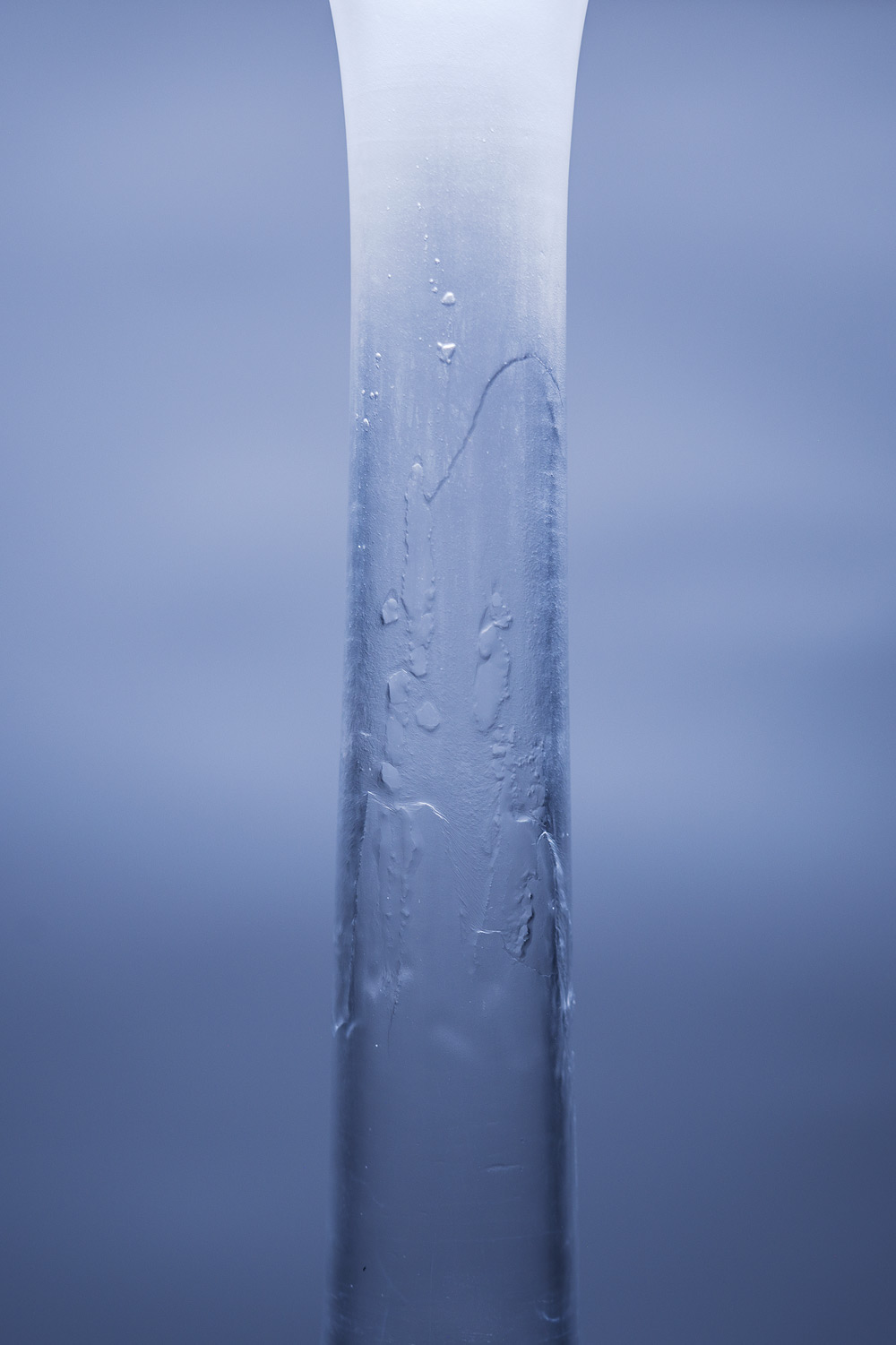 The glass vessels of Kentaro Senuma possess a texture as if water has risen up from the earth itself; when filled with water, they glow from within. Winters in Akita are long and severe, yet rich in texture—he blows the glass with a breath as soft as a sigh, sealing that texture into its surface. The tiny air bubbles resemble scattered snowflakes; the flow of the glass remained on its surface recalls frozen puddles. "I want to place the landscape of water into glass.” He said. In the morning light, they can appear like meltwater dripping through a forest at the edge of spring. How wonderful it is that a single object can hold so many shifting scenes.