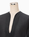 一見ワントーンでフラットに見える生地は、繊細な草木柄がジャカードで織られており、光が当たることで涼やかで爽やかな生地の中に柄が浮かび上がり、奥行きと深みのある表情が生み出される。すっぽりと柔らかに身体を覆うドレスは裾のスリットが軽やかな足捌きを叶え、様々なレイヤードスタイルを楽しめる。春夏シーズンにさらりと肌心地がよくリラックスムードを叶える1着に。